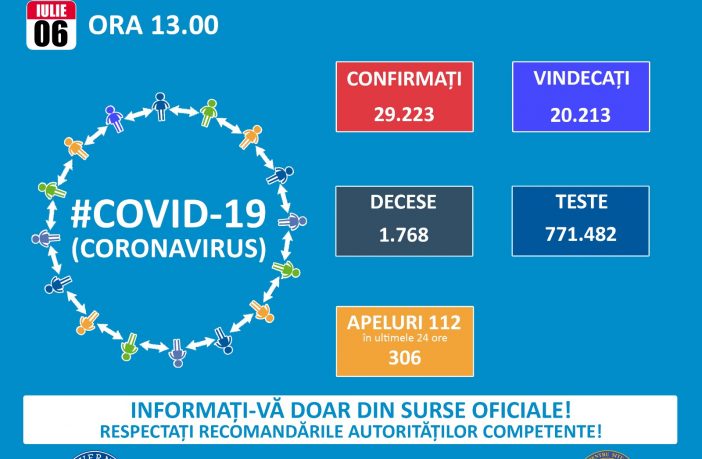Până astăzi, 6 iulie, pe teritoriul României, au fost confirmate 29.223 de cazuri de persoane infectate cu noul coronavirus (COVID – 19). Dintre persoanele confirmate pozitiv, 21.413 au fost externate, dintre care 20.213 de pacienți vindecați și 1.200 de pacienți asimptomatici, externați la 10 zile după depistare. Numărul de cazuri confirmate, pe județe, potrivit raportării Institutului Național de Sănătate Publică: Nr. crt. Județ Număr de cazuri confirmate 1. Alba 468 2. Arad 707 3. Argeș 1.016 4. Bacău 677 5. Bihor 696 6. Bistrița-Năsăud 574 7. Botoșani 1.047 8.…