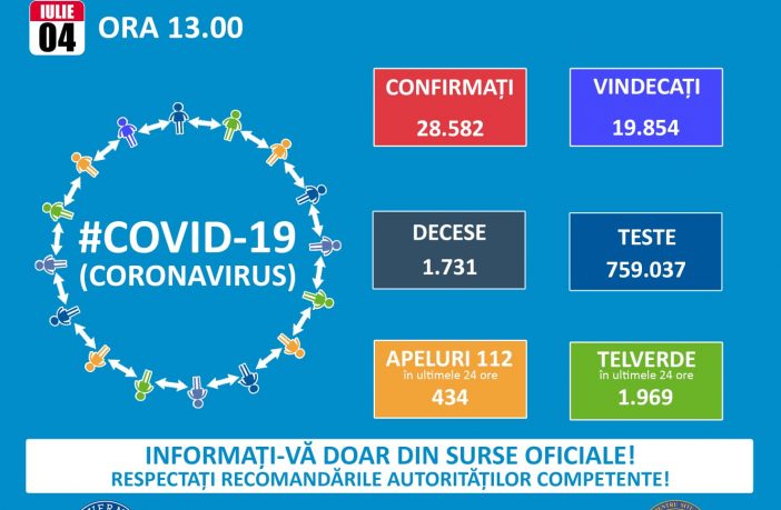 Până astăzi, 4 iulie, pe teritoriul României, au fost confirmate 28.582 de cazuri de persoane infectate cu noul coronavirus (COVID – 19). Dintre persoanele confirmate pozitiv, 20.861 au fost externate, dintre care 19.854 de pacienți vindecați și 1.007 pacienți asimptomatici, externați la 10 zile după depistare. Numărul de cazuri confirmate, pe județe, potrivit raportării Institutului Național de Sănătate Publică: Nr. crt. Județ Număr de cazuri confirmate 1. Alba 463 2. Arad 707 3. Argeș 946 4. Bacău 664 5. Bihor 679 6. Bistrița-Năsăud 561 7. Botoșani 1.041 8. Brașov 1.651…