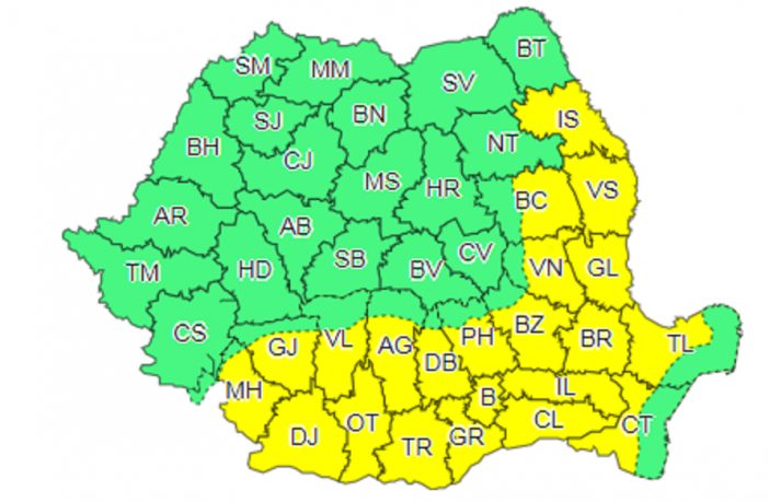 Administrația Națională de Meteorologie a emis primul cod galben de caniculă din această vară. Acesta este valabil pentru joi și vineri în Oltenia, Muntenia, vestul Dobrogei şi în sudul și centrul Moldovei. Temperaturile maxime vor atinge frecvent 35…36 de grade şi izolat 37 de grade, iar indicele temperatură-umezeală (ITU) va atinge și depăși ușor pragul critic de 80 de unități, astfel că disconfortul termic va fi accentuat. Indicele temperatură umezeală (ITU) va atinge pragul critic de 80 de unități pe arii restrânse și în restul zonelor de câmpie și podiș.…