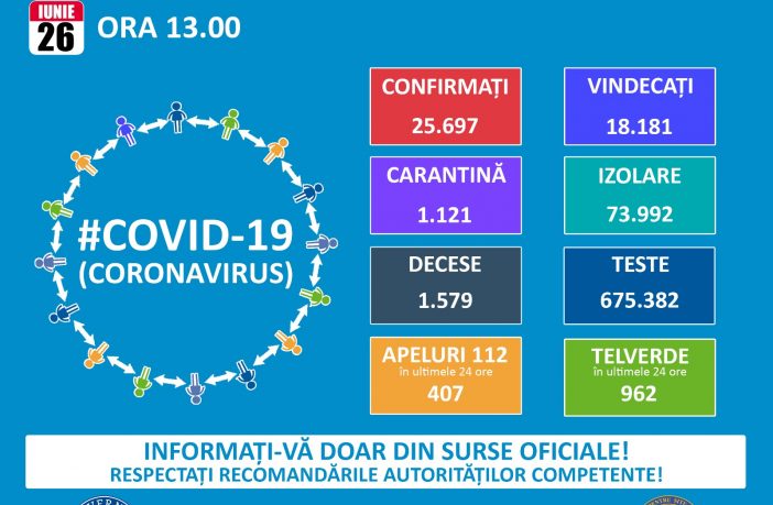 Până astăzi, 26 iunie, pe teritoriul României, au fost confirmate 25.697 cazuri de persoane infectate cu virusul COVID – 19 (coronavirus). Dintre persoanele confirmate pozitiv, 18.181 au fost declarate vindecate și externate. Numărul de cazuri confirmate, pe județe, potrivit raportării Institutului Național de Sănătate Publică: Nr. crt. Județ Număr de cazuri confirmate 1. Alba 431 2. Arad 706 3. Argeș 704 4. Bacău 608 5. Bihor 668 6. Bistrița-Năsăud 503 7. Botoșani 995 8. Brașov 1.351 9. Brăila 161 10. Buzău 479 11. Caraș-Severin 113 12. Călărași 163 13. Cluj…