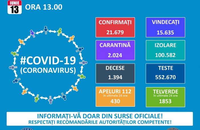Până astăzi, 13 iunie, pe teritoriul României, au fost confirmate 21.679 de cazuri de persoane infectate cu virusul COVID – 19 (coronavirus). Dintre persoanele confirmate pozitiv, 15.635 au fost declarate vindecate și externate. Numărul de cazuri confirmate, pe județe, potrivit raportării Institutului Național de Sănătate Publică: Nr. crt. Județ Număr de cazuri confirmate 1. Alba 411 2. Arad 703 3. Argeș 334 4. Bacău 559 5. Bihor 653 6. Bistrița-Năsăud 401 7. Botoșani 884 8. Brașov 977 9. Brăila 56 10. Buzău 276 11. Caraș-Severin 112 12. Călărași 117…