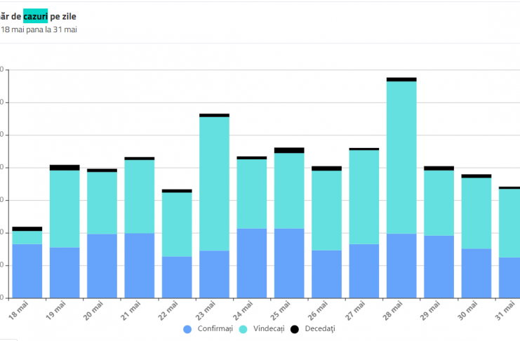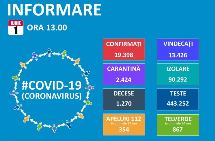 Până astăzi, 1 iunie, pe teritoriul României, au fost confirmate 19.398 de cazuri de persoane infectate cu virusul COVID – 19 (coronavirus). Dintre persoanele confirmate pozitiv, 13.426 au fost declarate vindecate și externate. Numărul de cazuri confirmate, pe județe, potrivit raportării Institutului Național de Sănătate Publică: Nr. crt. Județ Număr de cazuri confirmate 1. Alba 385 2. Arad 697 3. Argeș 263 4. Bacău 507 5. Bihor 612 6. Bistrița-Năsăud 336 7. Botoșani 772 8. Brașov 752 9. Brăila 28 10. Buzău 198 11. Caraș-Severin 112 12. Călărași 95 13. Cluj 557 14. Constanța…