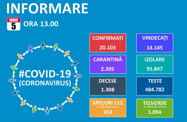 Până astăzi, 5 iunie, pe teritoriul României, au fost confirmate 20.103 de cazuri de persoane infectate cu virusul COVID – 19 (coronavirus). Dintre persoanele confirmate pozitiv, 14.145 au fost declarate vindecate și externate. Numărul de cazuri confirmate, pe județe, potrivit raportării Institutului Național de Sănătate Publică: Nr. crt. Județ Număr de cazuri confirmate 1. Alba 396 2. Arad 698 3. Argeș 275 4. Bacău 515 5. Bihor 635 6. Bistrița-Năsăud 360 7. Botoșani 812 8. Brașov 806 9. Brăila 43 10. Buzău 204 11. Caraș-Severin 112 12. Călărași 101 13.…