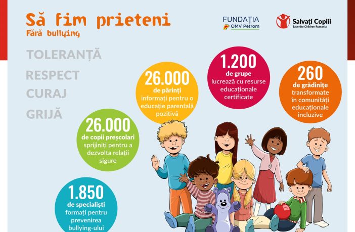 Salvați Copiii România, cu sprijinul Fundației OMV Petrom, extinde programul Să fim prieteni – Fără Bullying – un program de prevenire a bullying-ului, cu o metodologie dezvoltată de Mary Foundation și Salvați Copiii Danemarca – la peste 260 de grădinițe din București și din țară. Analiza preliminară derulată înainte de introducerea programului în grădinițe arată că 85% dintre profesorii din unitățile de învățământ selectate consideră că preșcolarii cu care lucrează se întâlnesc cu situații de bullying, iar 54% dintre ei afirmă că nu toți copiii au parteneri de joacă la grădiniță. 1.244…