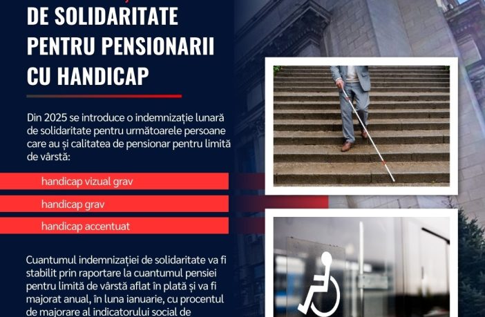 Guvernul României a aprobat, prin ordonanță de urgență, modificarea și completarea Legii nr. 448/2006 privind protecția și promovarea drepturilor persoanelor cu handicap, prin care se introduce, începând cu data de 1 ianuarie 2025, o indemnizație lunară de solidaritate pentru persoanele cu handicap vizual grav, handicap grav și handicap accentuat care au și calitatea de pensionar pentru limită de vârstă. Prin aceste măsuri se asigură o protecție socială echitabilă și se consolidează incluziunea acestor persoane, astfel încât veniturile să fie majorate anual. Cuantumul indemnizației de solidaritate va fi stabilit prin raportare…