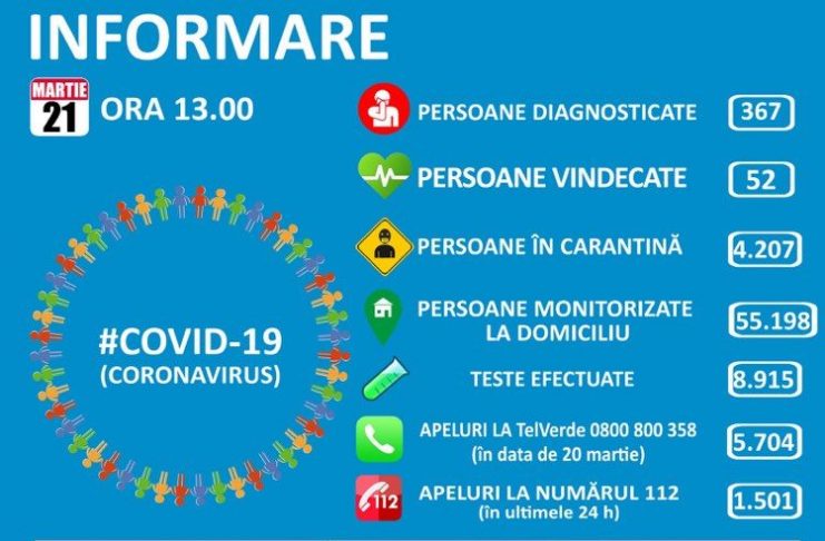 Până astăzi, 21 martie, pe teritoriul României, au fost confirmate 367 de cazuri de persoane infectate cu virusul COVID – 19 (coronavirus). Dintre cele 367 de persoane confirmate pozitiv, 52 au fost declarate vindecate și externate (36 la Timișoara, 11 la București, 3 la Craiova, unul la Constanța și unul la Iași). De la ultima informare transmisă de Grupul de Comunicare Strategică, transmisă ieri, 20 martie, ora 13.00, au fost înregistrate alte 59 de noi cazuri de îmbolnăvire. Pacienții nou confirmați au vârsta cuprinsă între un an și 74 de…