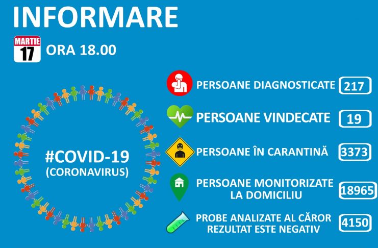 Până astăzi, 19 martie, pe teritoriul României, au fost confirmate 277 de cazuri de persoane infectate cu virusul COVID – 19 (coronavirus). Dintre cele 277 de persoane confirmate pozitiv, 25 au fost declarate vindecate și externate ( 16 la Timișoara, 8 la București și unul la Iași). De la ultima informare transmisă de Grupul de Comunicare Strategică, au fost înregistrate alte 17 noi cazuri de îmbolnăvire, astfel: 4 la Suceava, 3 la București, 2 la Cluj, 2 la Bistrița Năsăud, 2 la Covasna și câte unul la Iași, Dolj, Ilfov…