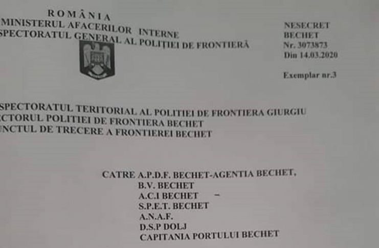 Punctul de Trecere a Frontierei Bechet a fost închis, începând cu această după-amiază. Decizia a fost luată în cadrul ședinței Comitetului Național pentru Situații Speciale de Urgență.