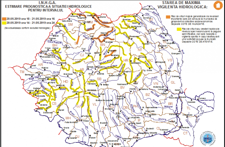 Având în vedere situaţia hidrometeorologică actuală şi prognoza meteorologică pentru următoarele 24 de ore, ca urmare a precipitaţiilor prognozate şi propagării se pot produce scurgeri importante pe versanţi, torenţi, pâraie, viituri rapide pe râurile mici cu posibile efecte de inundaţii locale, creşteri de debite şi niveluri cu posibile depăşiri ale COTELOR DE ATENŢIE, după cum urmează: COD GALBEN În intervalul 20.05.2019 ora 14:00 – 21.05.2019 ora 24:00 pe râurile din bazinele hidrografice: Tisa – sector aval S.H. Valea Vişeului, Vişeu, Iza (judeţul Maramureş), Tur (judeţul Satu Mare), Someşul Mare -…