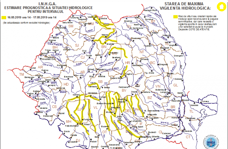 Având în vedere situaţia hidrometeorologică actuală şi prognoza meteorologică pentru următoarele 24 de ore, ca urmare a precipitaţiilor prognozate şi propagării se pot produce scurgeri importante pe versanţi, torenţi, pâraie, viituri rapide pe râurile mici cu posibile efecte de inundaţii locale, creşteri de debite şi niveluri cu posibile depăşiri ale COTELOR DE ATENŢIE, după cum urmează: COD GALBEN În intervalul 16.05.2019 ora 14:00 – 17.05.2019 ora 14:00 pe râurile din bazinele hidrografice: Vişeu, Iza (judeţul Maramureş), Someşul Mare (judeţul Bistriţa Năsăud), Mureş – bazin superior amonte S.H. Glodeni (judeţele Harghita…