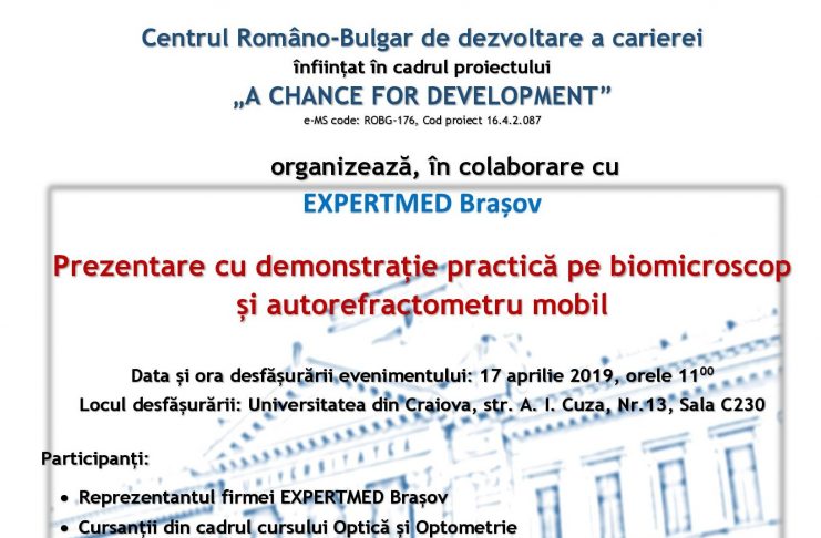 Workshop cu specialişti de top la Ştiinţe. Joi, 18 aprilie 2019, la ora 11, studenţii Departamentului de Fizică (Facultatea de Ştiinţe) și cursanții de la Optometrie sunt invitaţi la o demonstraţie practică pe biomicroscop şi autorefractometrul portabil, susţinută de managerul tehnic al Expertmed, Bogdan Rusu, în laboratorul de Optometrie, C230. Evenimentul este organizat în cadrul Centrului de carieră şi recrutare Ro – BG. Cu ajutorul biomicroscopului (achiziţionat prin proiectul „O şansă pentru dezvoltare”), studenţii vor putea vedea cum se realizează o investigație microscopică a polului anterior, a vitrosului şi a…