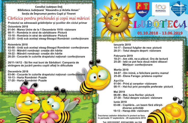 Biblioteca Județeană „Alexandru și Aristia Aman” anunță lansarea celei de-a IX-a ediții a proiectului „Cărticica pentru prichindei și copii mai măricei”. Proiectul se adresează preșcolarilor și elevilor, clasele I-IV, din municipiul Craiova. La înscrierile care se desfășoară în intervalul 17-28 septembrie 2018 sunt invitate să aplice exclusiv cadrele didactice. Structurată în 19 teme interactive, ediția actuală se suprapune anului școlar,urmând să debuteze în 1 octombrie 2018. Inițiat din dorința de a lărgi sfera preocupărilor celor mici, de a sprijini școala și familia în procesul de educație, proiectul „Cărticica pentru prichindei…