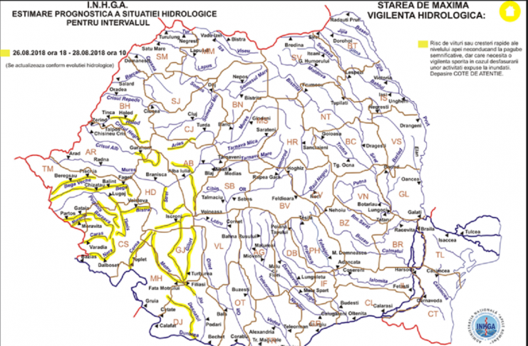 Având în vedere situaţia hidrometeorologică actuală şi prognoza meteorologică pentru următoarele 48 de ore, ca urmare a precipitaţiilor prognozate şi propagării, în perioada 26.08.2018 ora 18:00 – 28.08.2018 ora 10:00 se pot produce scurgeri importante pe versanţi, torenţi, pâraie, viituri rapide pe râurile mici cu posibile efecte de inundaţii locale şi creşteri de debite şi niveluri cu posibile depăşiri ale COTELOR DE ATENŢIE. Astfel, în perioada menţionată avem COD GALBEN de inundaţii pe râurile din bazinele hidrografice: Desnățui şi Jiu – bazin superior și mijlociu (județele: Hunedoara, Gorj, Mehedinți și…