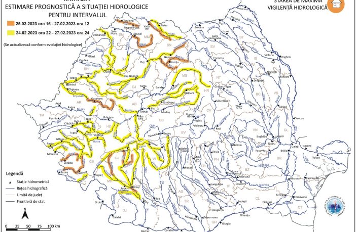 Având în vedere situaţia hidrometeorologică actuală şi prognoza meteorologică pentru următoarele 72 de ore, ca urmare a precipitaţiilor lichide prognozate, propagării şi cedării apei din stratul de zăpadă, se pot produce scurgeri importante pe versanţi, torenţi, pâraie, viituri rapide pe râurile mici cu posibile efecte de inundaţii locale şi creşteri de debite şi niveluri cu posibile depăşiri ale COTELOR DE APĂRARE. În acest context, în intervalul 25.02.2023, ora 12:00 – 27.02.2023, ora 24:00, râul Jiu – bazin amonte S.H. Podari (judeţele: Hunedoara, Gorj, Mehedinţi şi Dolj) și afluenţii mici aferenţi sectorului…