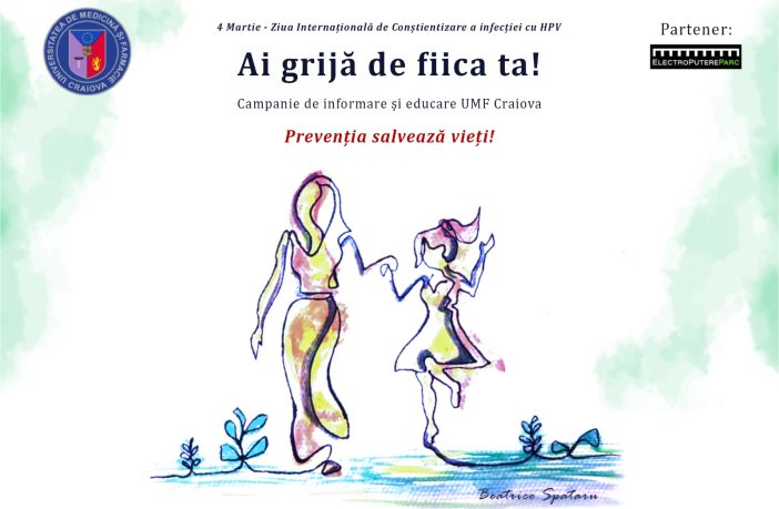 Campanie de informare și educare UMF Craiova 4 martie este Ziua Internațională de Conștientizare a HPV. Universitatea de Medicină și Farmacie din Craiova continuă programul de informare și educare pentru prevenție și inițiază campania „Ai grijă de fiica ta!”. Pe 4 martie, în Electroputere Mall, de la ora 13.00, craiovenii îi vor întâlni pe studenții UMF Craiova, alături de profesorii lor, și vor afla căi prin care s-a ajuns și se mai poate ajunge la ZERO cazuri de cancer cauzat de infecția HPV. Vor fi alături de studenți: prof. univ.…