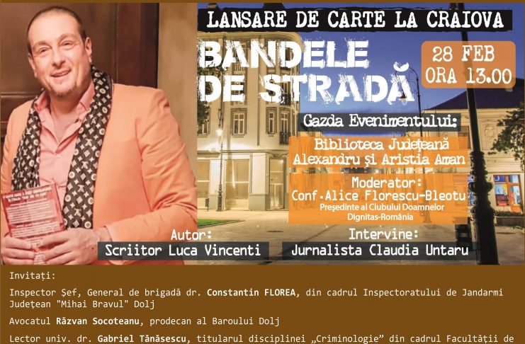 Biblioteca Județeană “Alexandru și Aristia Aman” găzduiește miercuri, 28.02.2018, începând cu ora 13.00, în sala “Acad. Dinu C. Giurescu”, lansarea volumului „Bandele de stradă”, autor Luca Vincenti. Evenimentul va fi moderat de conf. univ. dr. Alice Florescu-Bleotu, Președinte al “Clubului Doamnelor Dignitas” – România. INVITATI: Constantin Florea, Inspector Şef, General de brigadă, Inspectoratul Judeţean de Jandarmi „Mihai Bravul” Dolj; Răzvan Socoteanu, prodecan al Baroului Dolj; univ. dr. Gabriel Tănăsescu; Claudia Untaru, jurnalist. „Bandele de stradă”, scrisă de Luca Vincenti, este o carte cenzurată timp de 15 ani, la care autorul…