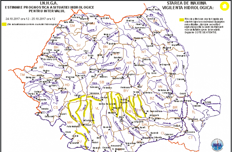 Cod galben de inundații în bazinele hidrografice ale Desnăţui, Jiu, Olt, Argeş, Ialomiţa – bazin superior, Prahova – bazin superior şi afluenţi bazin mijlociu şi inferior şi afluenţii mici ai Dunării aferenţi sectorului amonte Drobeta Tr. Severin pânămiercuri l=în jurul orei 12,00. Sunt vizate scurgeri importante pe versanți, torenți și pâraie, viituri rapide pe râurile mici cu posibile efecte de inundații locale și creșteri de debite și niveluri pe unele râuri din bazinele hidrografice menționate, cu posibile depășiri ale COTELOR DE ATENŢIE Având în vedere situaţia hidrometeorologică actuală şi prognoza…