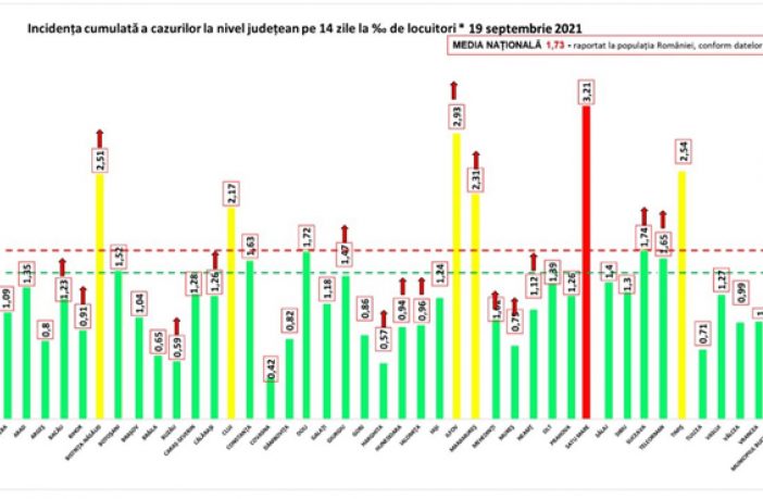 Bistrița Năsăud, Cluj, Ilfov, Maramureș, Timiș și Municipiul București sunt oficial, în scenariul galben, cu indicențe de peste 2 ‰, în timp ce Satu Mare se află deja în scenariul roșu, cu 3,21‰. Numai în ultimele 24 ore au fost confirmate 3817 cazuri noi din 14.327 teste RT – PCR efectuate (5.174 în baza definiției de caz și a protocolului medical și 9.153 la cerere) și 21.129 de teste rapide antigenice. De asemenea, în același interval, 58 de persoane (32 bărbați și 26 femei) au pierdut bătălia pentru viață în…