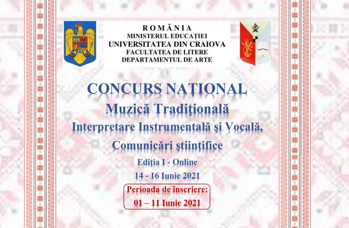 Universitatea din Craiova, prin Departamentul de Arte din cadrul Facultății de Litere, organizează prima ediție a Concursului Național de Muzică Tradițională cu următoarele secțiuni: instrumente cu coarde, instrumente de suflat din lemn și alamă, instrumente populare, muzică vocală tradițională, precum și o serie de comunicări științifice despre stilistica și interpretarea folclorului muzical. Concursul este dedicat elevilor de licee vocaționale de clasele a XI-a și a XII-a, studenților și masteranzilor care nu depășesc vârsta de 30 ani. Din cauza perioadei de pandemie, această primă ediție va avea loc în mediul online.…