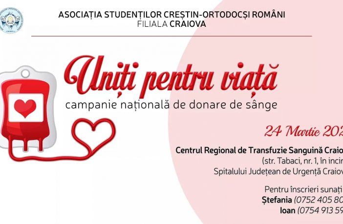 Asociaţia Studenţilor Creştin – Ortodocşi Români (A.S.C.O.R.), filiala Craiova, se alătură celei de-a doua ediţii a Campaniei naţionale de donare de sânge, organizată de A.S.C.O.R. Bucureşti sub genericul „Uniţi pentru viaţă”. În judeţul Dolj, campania se desfăşoară cu binecuvântarea Înaltpreasfinţitului Părinte Irineu, Arhiepiscopul Craiovei şi Mitropolitul Olteniei. La Craiova, acţiunea se va desfăşura în data de 24 martie, la Centrul de Transfuzie Sanguină (str. Tabaci, nr.1, în incinta Spitalului Judeţean de Urgenţă, intrarea dinspre policlinică), între orele 8.00 – 13.00. Înscrierile se pot face la numerele de telefon 0752.405.809 /…