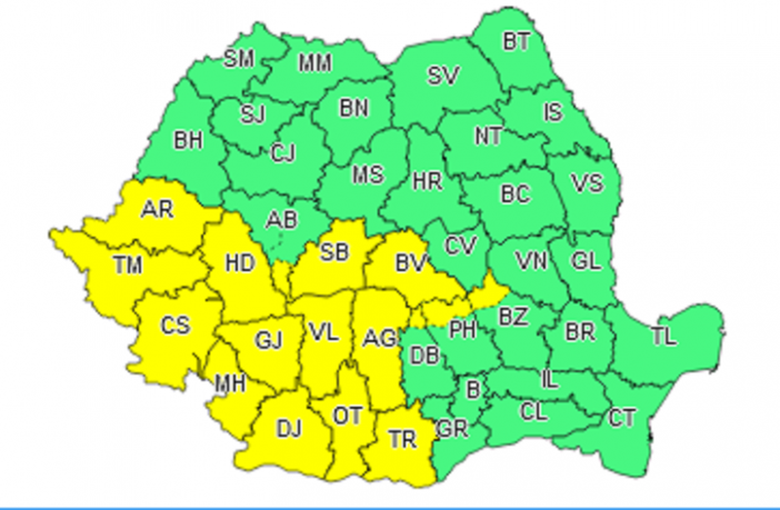 Administrația Națională de Meteorologie a emis o adertizare de Cod galben de ploi și vânt pentru intervalul 12 octombrie, ora 21:00 – 13 octombrie, ora 09:00. Astfel, în acest interval, se vor semnala intensificări ale vântului și ploi însemnate cantitativ în Banat, Oltenia, sudul Transilvaniei și al Crișanei, precum și în vestul și nordul Munteniei. Vântul va avea temporar intensificări, cu viteze de 55…65 km/h, iar pe crestele Carpaților Meridionali și de Curbură va sufla tare, cu rafale ce vor depăși 90…100 km/h. În vestul și sud-vestul teritoriului va ploua,…