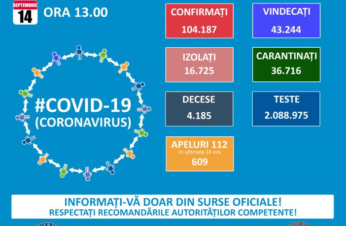 Până astăzi, 14 septembrie, pe teritoriul României, au fost confirmate 104.187 de cazuri de persoane infectate cu noul coronavirus (COVID – 19). 43.244 de pacienți au fost declarați vindecați și 11.374 de pacienți asimptomatici au fost externați la 10 zile după depistare. În urma testelor efectuate la nivel național, față de ultima raportare, au fost înregistrate 692 cazuri noi de persoane infectate cu SARS – CoV – 2 (COVID – 19), acestea fiind cazuri care nu au mai avut anterior un test pozitiv. Distribuția pe județe a cazurilor per total…