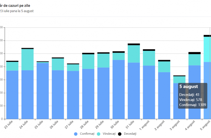 Până astăzi, 5 august, pe teritoriul României, au fost confirmate 56.550 de cazuri de persoane infectate cu noul coronavirus (COVID – 19). 28.584 de pacienți au fost declarați vindecați și 5.370 de pacienți asimptomatici au fost externați la 10 zile după depistare. În urma testelor efectuate la nivel național, față de ultima raportare, au fost înregistrate 1.309 cazuri noi de persoane infectate cu SARS – CoV – 2 (COVID – 19), acestea fiind cazuri care nu au mai avut anterior un test pozitiv. Distribuția pe județe a cazurilor per total…