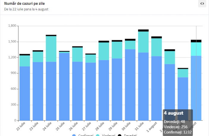 Până astăzi, 4 august, pe teritoriul României, au fost confirmate 55.241 de cazuri de persoane infectate cu noul coronavirus (COVID – 19). 28.006 pacienți au fost declarați vindecați și 5.136 de pacienți asimptomatici au fost externați la 10 zile după depistare. În urma testelor efectuate la nivel național, față de ultima raportare, au fost înregistrate 1.232 de cazuri noi de persoane infectate cu SARS – CoV – 2 (COVID – 19), acestea fiind cazuri care nu au mai avut anterior un test pozitiv. Distribuția pe județe a cazurilor per total…