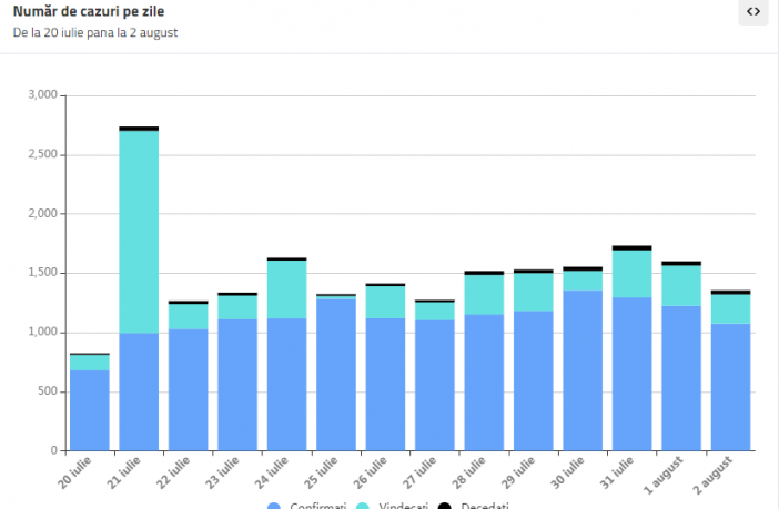 Până astăzi, 2 august, pe teritoriul României, au fost confirmate 53.186 de cazuri de persoane infectate cu noul coronavirus (COVID – 19). 27.592 de pacienți au fost declarați vindecați și 4.777 de pacienți asimptomatici au fost externați la 10 zile după depistare. În urma testelor efectuate la nivel național, față de ultima raportare, au fost înregistrate 1.075 de cazuri noi de persoane infectate cu SARS – CoV – 2 (COVID – 19), acestea fiind cazuri care nu au mai avut anterior un test pozitiv. Distribuția pe județe a cazurilor per…