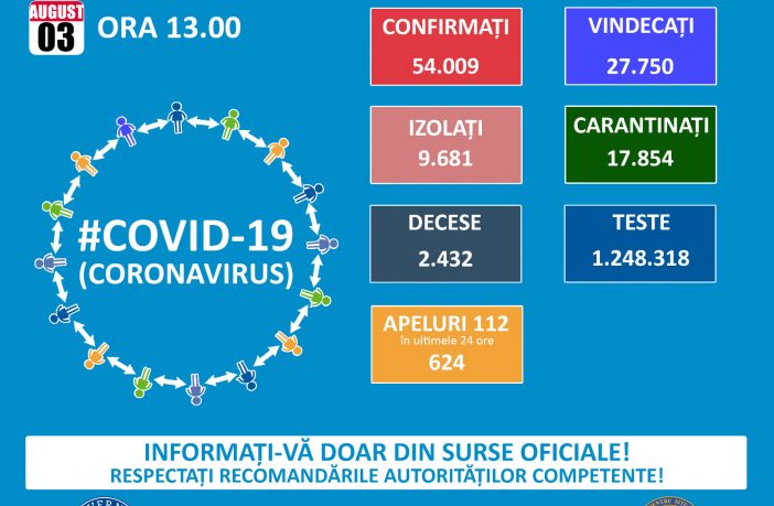 Până astăzi, 3 august, pe teritoriul României, au fost confirmate 54.009 de cazuri de persoane infectate cu noul coronavirus (COVID – 19). 27.750 pacienți au fost declarați vindecați și 4.807 pacienți asimptomatici au fost externați la 10 zile după depistare. În urma testelor efectuate la nivel național, față de ultima raportare, au fost înregistrate 823 cazuri noi de persoane infectate cu SARS – CoV – 2 (COVID – 19), acestea fiind cazuri care nu au mai avut anterior un test pozitiv. Distribuția pe județe a cazurilor per total și a…