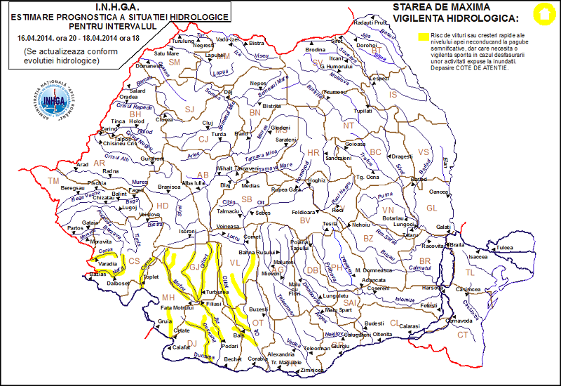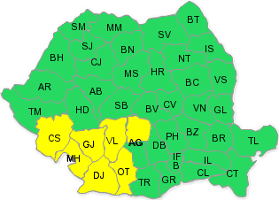 Apele Române avertizează că ploile din zilelel următoare vor aduce și scurgeri importante pe versanţi, torenţi şi pâraie, viituri rapide pe râurile mici cu posibile efecte de inundaţii locale şi creşteri de debite pe unele râuri din bazinul hidrografic al Jiului. Astfel că, având în vedere situaţia hidrometeorologică actuală şi prognoza meteorologică pentru următoarele 72 ore, se instituie COD GALBEN Pe râurile din bazinele hidrografice: Bega Veche, Bega, Timiş mijlociu şi inferior şi afluenţii săi, Bârzava, Moraviţa, Caraş, Nera, Cerna (judeţele Caraş Severin şi Timiş), Drincea, Desnăţui, Jiu mijlociu şi inferior şi afluenţii săi (judeţele Mehedinţi, Gorj şi Dolj). Aceste fenomene se pot produce cu probabilitate mai mare pe râurile din judeţele Mehedinţi şi Dolj.