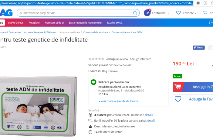 Pe una dintre cele mai cunoscute platforme de vânzări on-line se găsește un … kit de infidelitate. Vânzătorii promit că analizele vor fi efectuate într-un laborator din Statele Unite ale Americii. Un astfel de pachet conține, conform vânzătorului, „Recoltatoare sterile tip ecuvion, cate 4 bucati pentru fiecare persoana testata, Plicuri pentru sigilarea esantioanelor, cu sigiliu care evidentiaza orice incercare de dezlipire, Manusi sterile pentru manipulare, Plic de retur pentru curierat, Instructiuni clare si detaliate pentru recoltarea casnica a esantionului bucal, Formulare specifice pentru laborator, Contract de prestare a serviciilor, necesita…