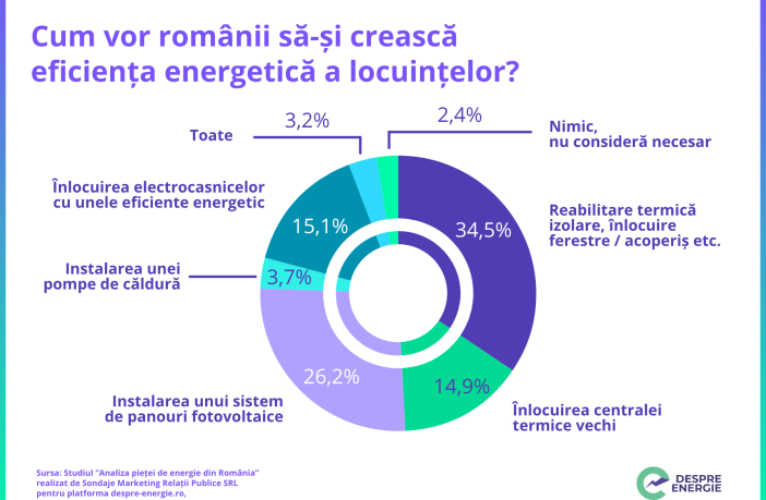 Aproximativ 44% dintre români au în vedere să investească în acest an în diverse proiecte de eficiență energetică a caselor în care locuiesc, de la izolare termică, înlocuirea electrocasnicelor, până la montarea de sisteme de panouri fotovoltaice, finanțarea urmând să fie asigurată din surse proprii (circa 49%), din credite bancare (13,5%) sau alte surse, reiese dintr-o cercetare sociologică realizată pentru platforma despre-energie.ro, un proiect al companiilor E.ON și Delgaz Grid. În timp ce mulți dintre conaționalii noștri sunt preocupați de identificarea unor soluții care să le permită să își țină…