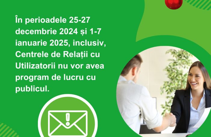 Operatorul Distribuţie Oltenia acordă angajaților 3 zile libere în perioada 25-27 decembrie 2024, respectiv 6 zile libere în perioada 1-7 ianuarie 2025, cu prilejul sărbătorilor de iarna, astfel că Centrele de Relații cu Utilizatorii Distribuție Oltenia își întrerup activitatea miercuri, 25 decembrie 2024, respectiv miercuri, 1 ianuarie 2025. Revenirea la programul normal de funcționare va avea loc în data de 30 decembrie 2024, respectiv 8 ianuarie 2025, în cazul Centrelor de Relații cu Utilizatorii din localitățile: Alexandria, Craiova, Drobeta Turnu Severin, Pitești, Râmnicu Vâlcea, Slatina, Târgu Jiu, Roşiorii de Vede,…