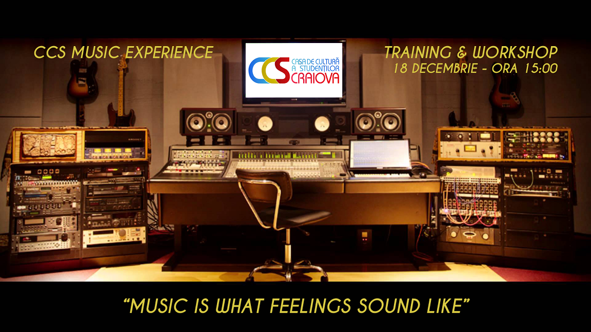 In data de  18 decembrie 2018 incepand cu ora 15:00, Casa de Cultura a Studentilor din Craiova organizeaza proiectul “CCS Music Experience” ce are ca scop sustinerea tinerelor talente autohnone prin organizarea unor sesiuni de formare menite sa ii ajute in dezvoltarea unei viitoare in domeniul muzical.