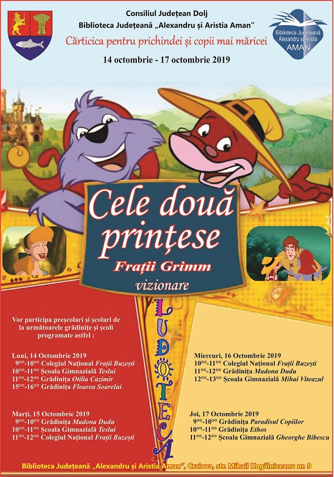 Biblioteca Județeană „Alexandru și Aristia Aman” organizează, în perioada 14-17 octombrie 2019, în cadrul proiectului „Cărticica pentru prichindei și copii mai măricei”, cea de-a doua activitate educațională: „Cele două prințese – Frații Grimm (vizionare).