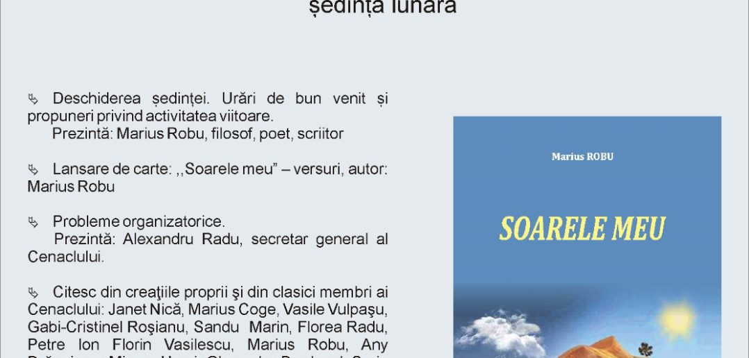 În cadrul ședinței va fi lansat volumul de versuri „Soarele meu”, autor Marius Robu și se vor discuta detaliile organizatorice ale activității cenaclului.