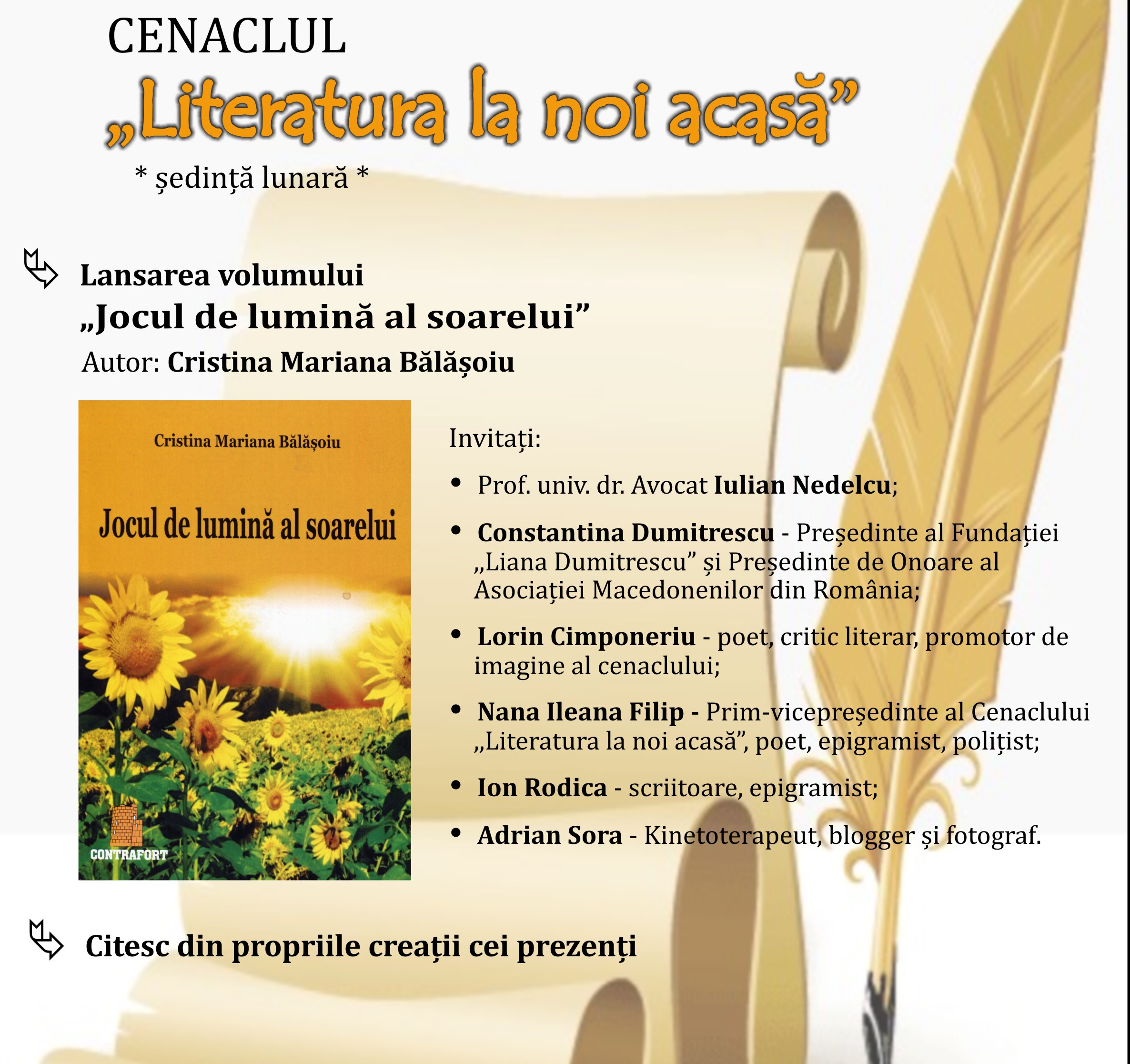 În cadrul manifestării va fi lansat volumul ,,Jocul de lumină al soarelui”, autor Cristina Mariana Bălășoiu. De asemenea, participanții vor lectura din creațiile proprii.