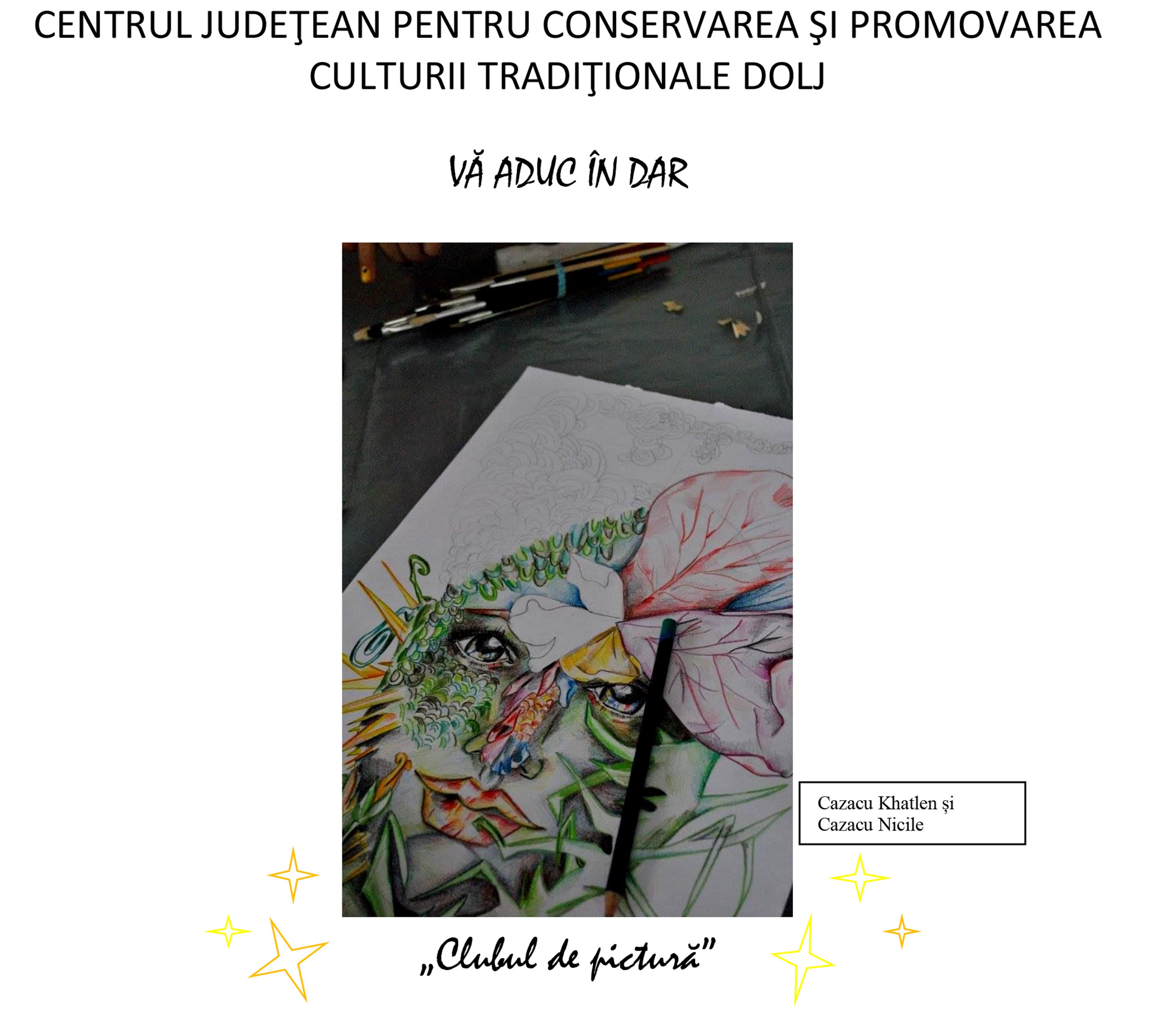 Consiliul Judeţean Dolj, Centrul Judeţean pentru Conservarea şi Promovarea Culturii Tradiţionale Dolj, împreună cu prof. Dorina Smarandache, cadru didactic la Școlile Gimnaziale „Ion Creangă“, „Sf. Dumitru“ și „Decebal“, deschid Clubul de pictură în Galeriile „Cromatic“, marți, 27 iunie, la ora 10:00.