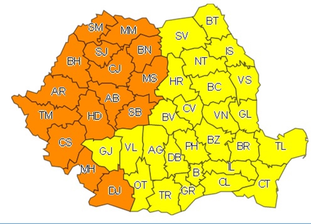 COD PORTOCALIU: Miercuri și joi (2 și 3 august), valul de căldură se va intensifica şi va cuprinde toată țara. Vremea va fi caniculară, indicele temperatură-umezeală (ITU) se va situa în general peste pragul critic de 80 de unităţi, iar local minimele nocturne nu vor coborî sub 20 de grade. În Banat, Crișana, Maramureș, cea mai mare parte a Transilvaniei și în sud-vestul Olteniei disconfortul termic va fi deosebit de accentuat și se vor înregistra temperaturi maxime cuprinse frecvent între 36 și 39 de grade.