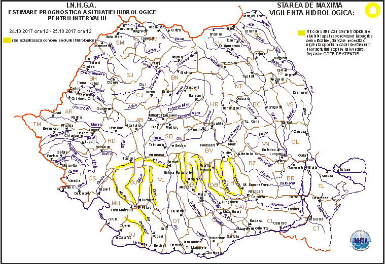 Fenomenele hidrologice periculoase se pot produce cu probabilitate şi intensitate mai mare pe unele râuri mici din bazinele superioare ale Ialomiţei şi Prahovei ȋn intervalul 24.10.2017 ora 13:00 – 24.10.2017 ora 22:00, iar ȋn intervalul 24.10.2017 ora 18:00 – 25.10.2017 ora 06:00 pe afluenţii mici ai Dunării aferenţi sectorului amonte Orşova şi pe unele râuri mici din judeţele Mehedinţi, Gorj şi Vâlcea.