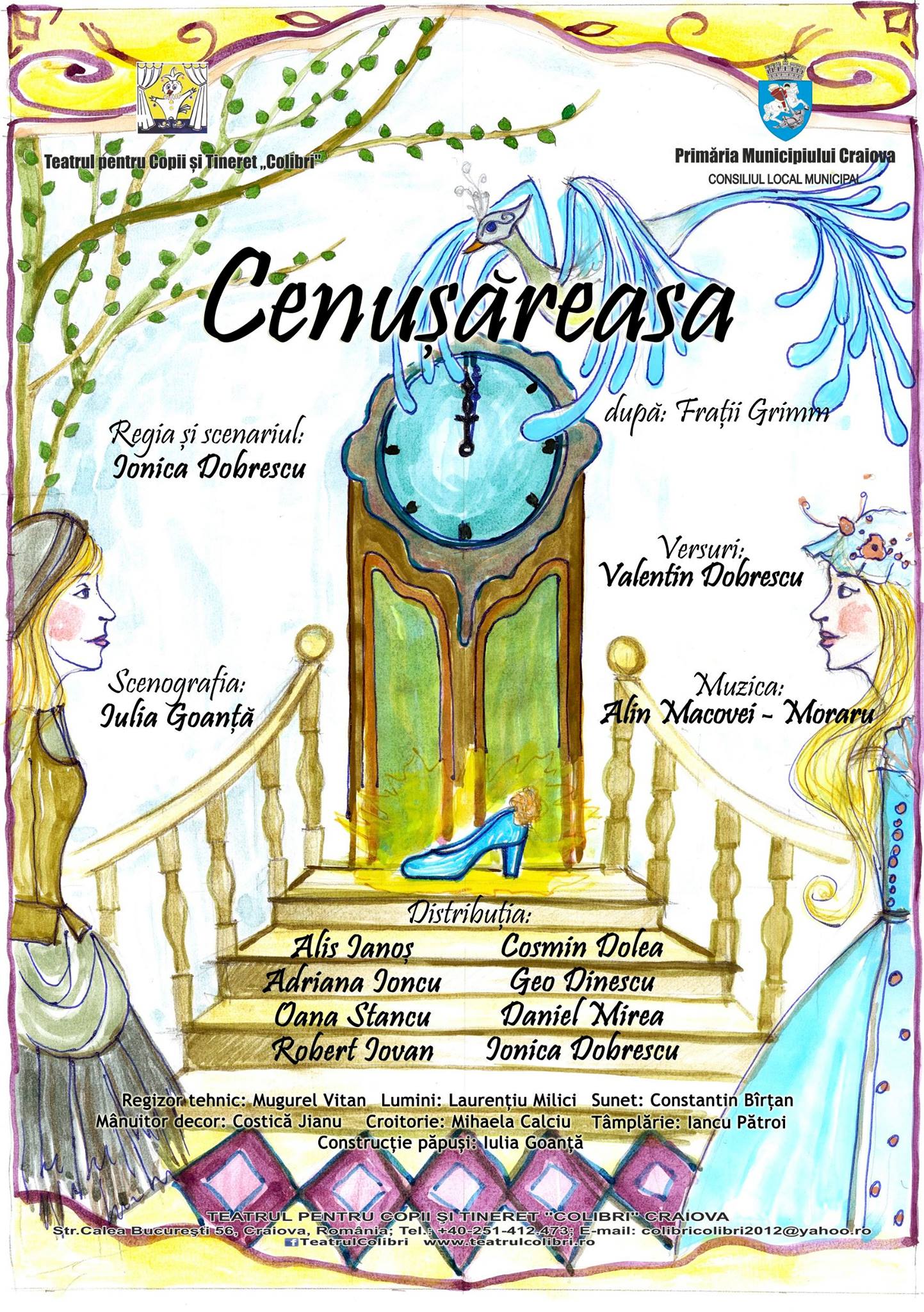 Spectacolul „Cenușăreasa“ poartă mantia trecutului de poveste, cu inserții verbale și muzicale actuale, creat pentru copii, dar mai ales pentru copilul din fiecare. Este o dorință împlinită, în care imaginația unui copil a devenit poveste pe scenă, a crescut precum Alunul udat cu lacrimile Cenușăresei.