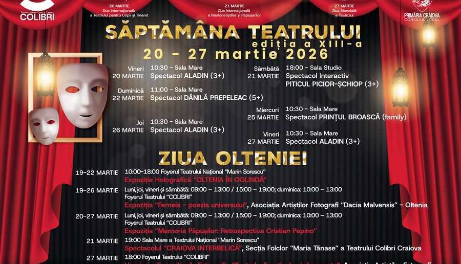 Teatrul pentru copii și tineret Colibri vă invită, în perioada 20-27 martie 2026, la spectacole de teatru, folclor, expoziții de fotografie, păpuși și holograme, în cadrul proiectului Săptămâna Teatrului – ediția a XIII-a. Derulate pe parcursul a opt zile, evenimentele marchează patru mari sărbători: Ziua Internațională a Teatrului pentru Copii și Tineret (20 martie), Ziua Internațională a Marionetiștilor și Păpușarilor (21 martie), Ziua Mondială a Teatrului (27 martie) și Ziua Olteniei.