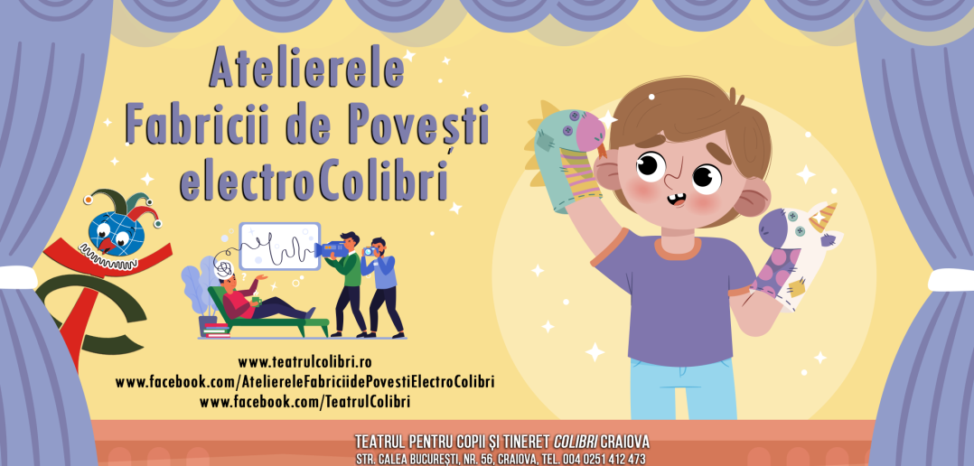 Înscrieri se fac în intervalul 26 – 30 septembrie 2022, doar prin formular on-line, link-urile pentru fiecare atelier în parte fiind disponibile din 26 septembrie, de la ora 00:01, până în data de 30 septembrie – ora 14:00 pe site-ul instituţiei: www.teatrulcolibri.ro şi pe paginile de facebook: AteliereleFabriciidePovestiElectroColibri/ și TeatrulColibri.