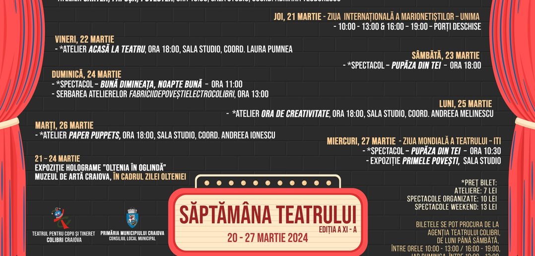 Teatrul pentru copii și tineret Colibri organizează și anul acesta Săptămâna Teatrului, proiect ajuns la cea de-a XI-a ediție. Timp de 8 zile, între 20 – 27 martie, craiovenii sunt așteptați cu spectacole, ateliere de creație, Porți Deschise, expoziții, celebrând cele trei mari sărbători: Ziua Internaţională a Teatrului pentru copii şi tineret – 20 martie, Ziua Internațională a Marionetiştilor şi Păpuşarilor – 21 martie şi Ziua Mondială a Teatrului – 27 martie.
