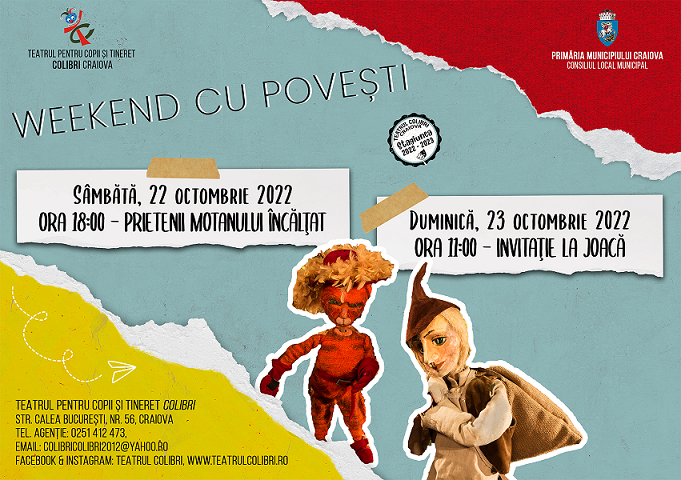 Teatrul pentru copii și tineret Colibri ne propune o vacanță creativă, plină cu surprize. Timp de 9 zile, în perioada 22 – 30 octombrie 2022, în Fabrica de povești vor fi spectacole, ateliere de creație pentru toate vârstele, o zi de călătorie prin culisele teatrului, va fi vernisată expoziția „Vrăjitoare desprinse din povești“ și se va da startul campaniei „Du povestea mai departe“ – campanie de colectare cărți, jucării și rechizite pentru a fi dăruite copiilor defavorizați, cu ocazia sărbătorilor de iarnă.