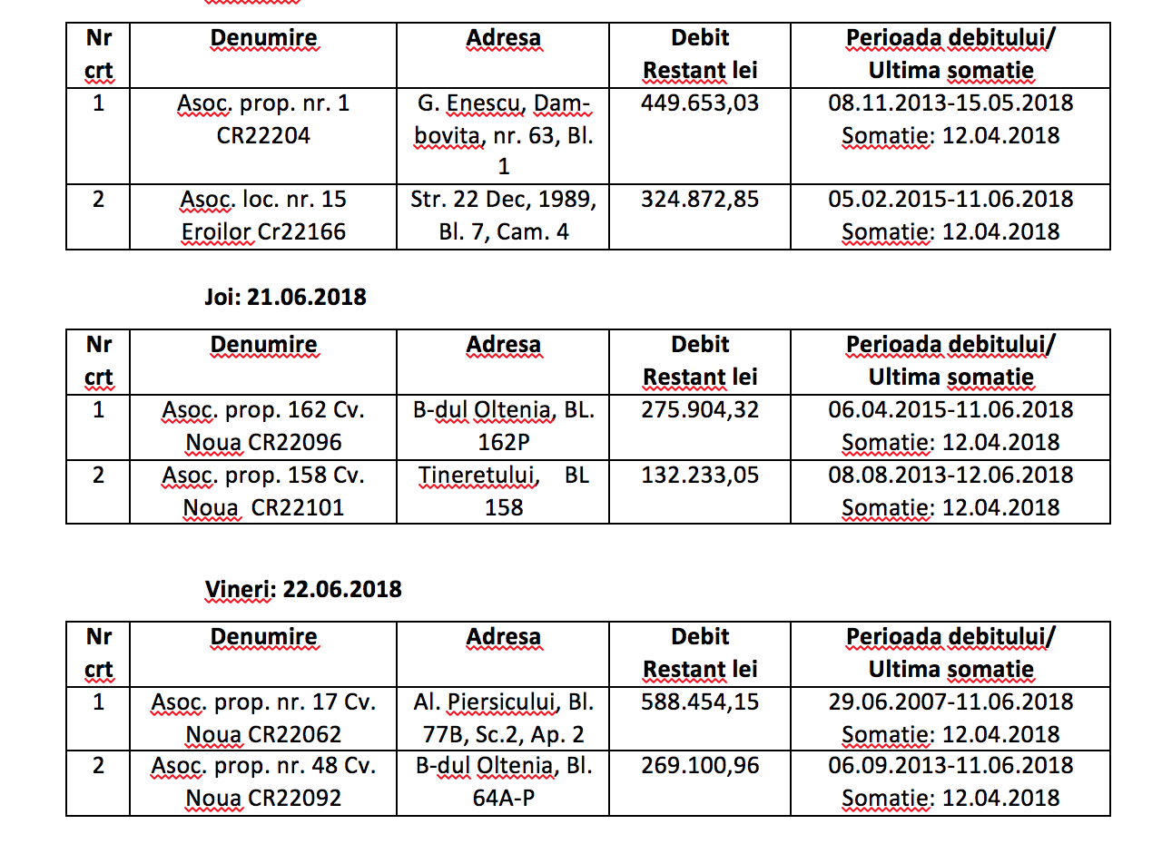 Compania de Apă Oltenia SA aduce la cunoștința utilizatorilor planificarea pentru perioada 20.06- 22.06.2018 a debranșărilor la asociațiile de proprietari din Municipiul Craiova, care înregistrează restanțe la plata facturilor serviciilor de apă și canalizare. Pentru miercuri sunt programate două asociații. La lef pentru urmatoarele doua zile.