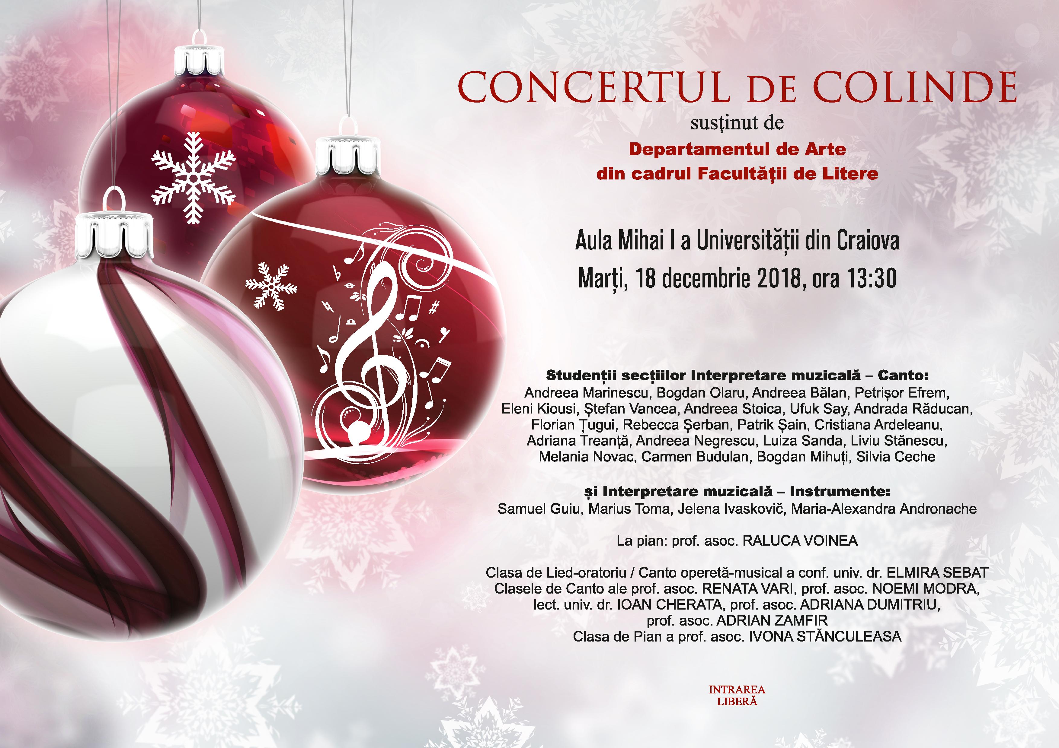 Pe 18 decembrie, de la ora 13.30, în Aula „Mihai I al României”, va avea loc Concertul de colinde susţinut de studenţii domeniului de studii Muzică (Departamentul de Arte, Facultatea de Litere). Studenţii vor interpreta colinde culese şi întocmite de Tiberiu Brediceanu, colinde din cultura nord-americană, dar şi lucrări din repertoriul clasic al virtuozităţii vocale şi instrumentale.