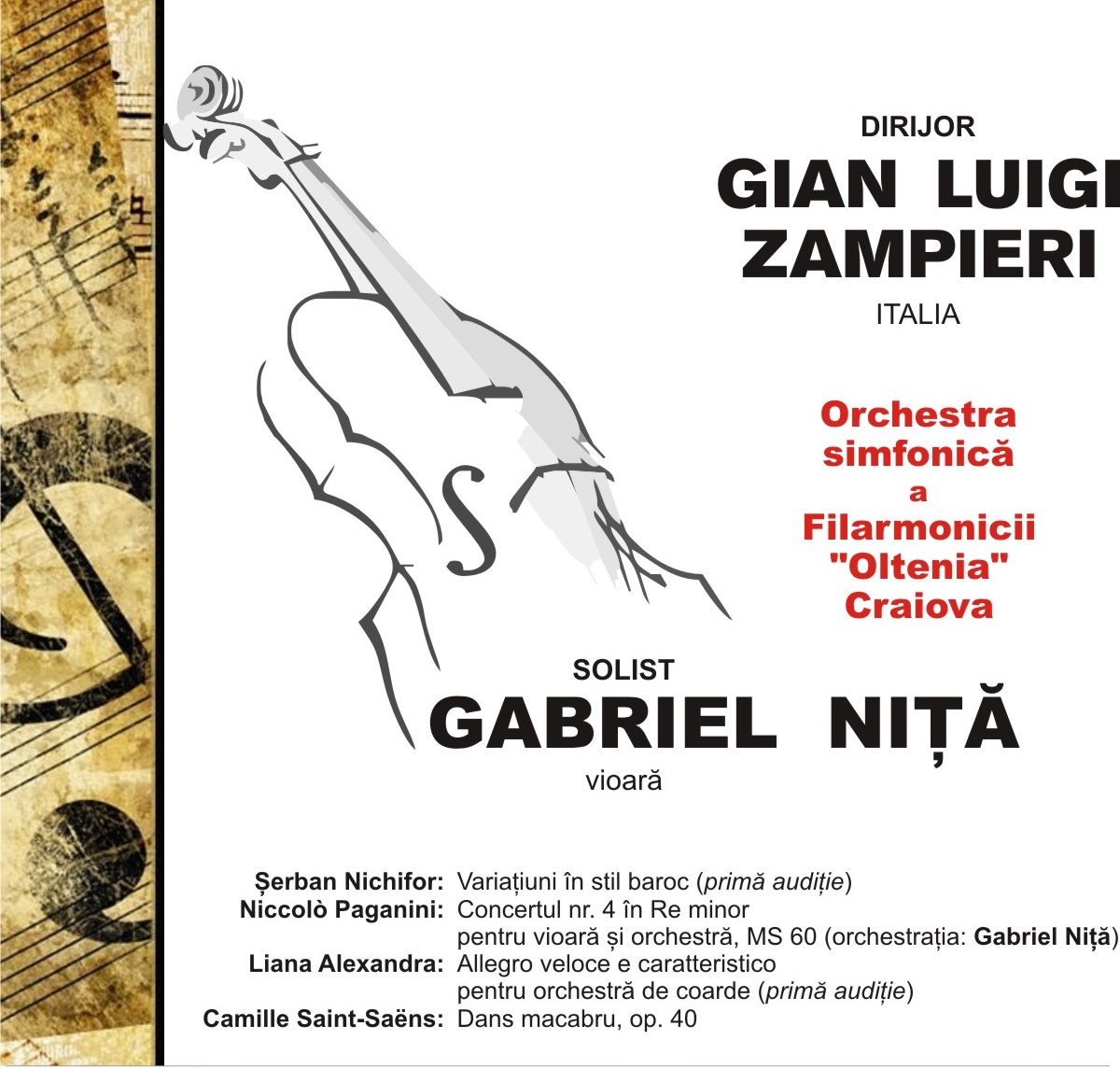 Violonistul craiovean Gabriel Niță vine în faţa publicului meloman cu inegalabilul Concert nr.4 în Re minor de Niccolò Paganini, despre care, în anii trecuți, presa craioveană consemna: „Condusă cu o tehnică a interpretării impecabilă, vioara a vrăjit audienţa (…) făcându-i pe spectatori să recunoască din nou geniul ‹demonului viorii›, aşa cum a fost apreciat Niccolò Paganini…” (Laura Moţîrliche, Cuvântul Libertăţii, 3 febr.2014, p.9). Cadenza din prima parte a piesei este scrisă chiar de interpret, de altfel un foarte bun orchestrator, pasajele de mare virtuozitate fiind susținute de minunata vioară Giuseppe Micheli – 1891, pe care am avut ocazia să o ascultăm în ultimii ani.