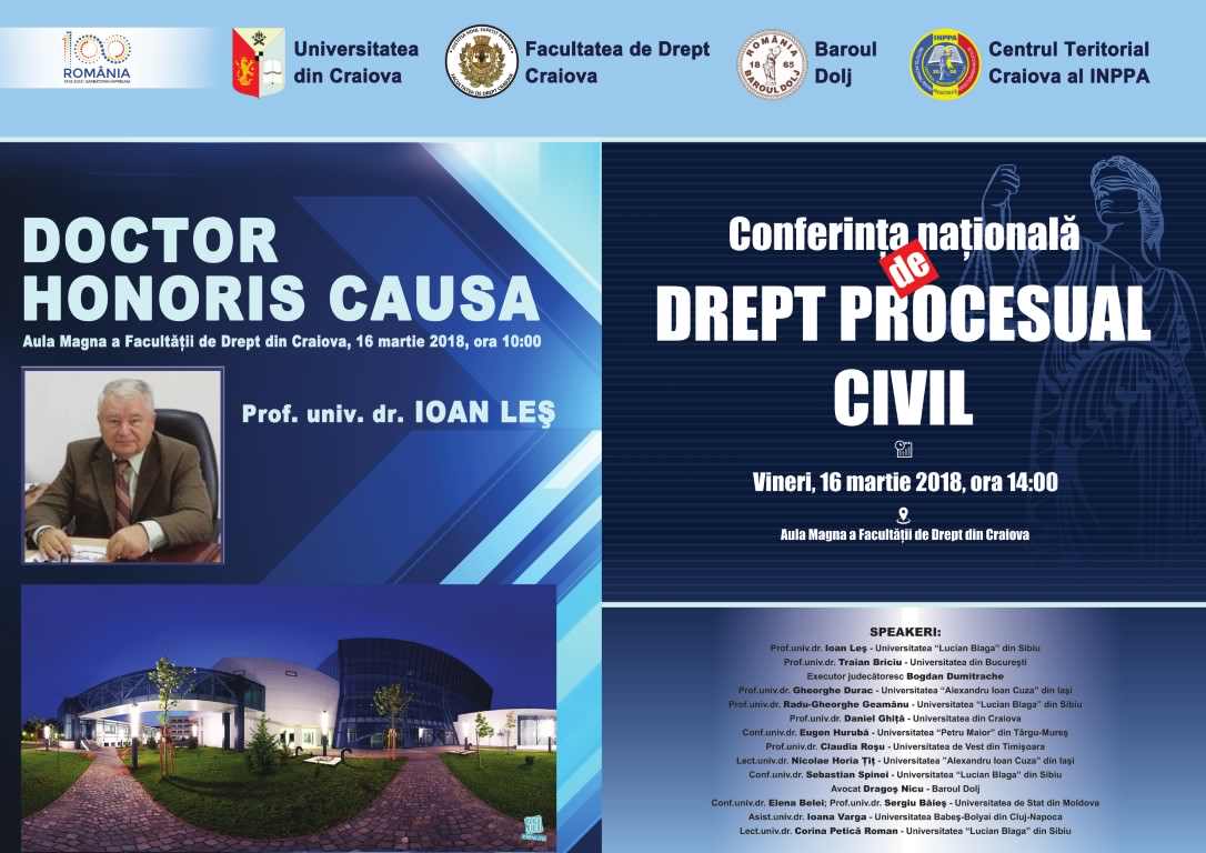 Vineri, 16 martie 2018, va fi organizată CONFERINŢA NAŢIONALĂ DE DREPT PROCESUAL CIVIL de Facultatea de Drept din cadrul Universității din Craiova în parteneriat cu Baroul Dolj, Centrul Teritorial Craiova al Institutului Național pentru Pregătirea şi Perfecţionarea Avocaţilor, Camera Notarilor Publici Craiova, Camera Executorilor Judecătoreşti de pe lângă Curtea de Apel Craiova și Centrul de Studii şi Cercetări de Drept Privat din cadrul Facultăţii de Drept a Universităţii din Craiova.